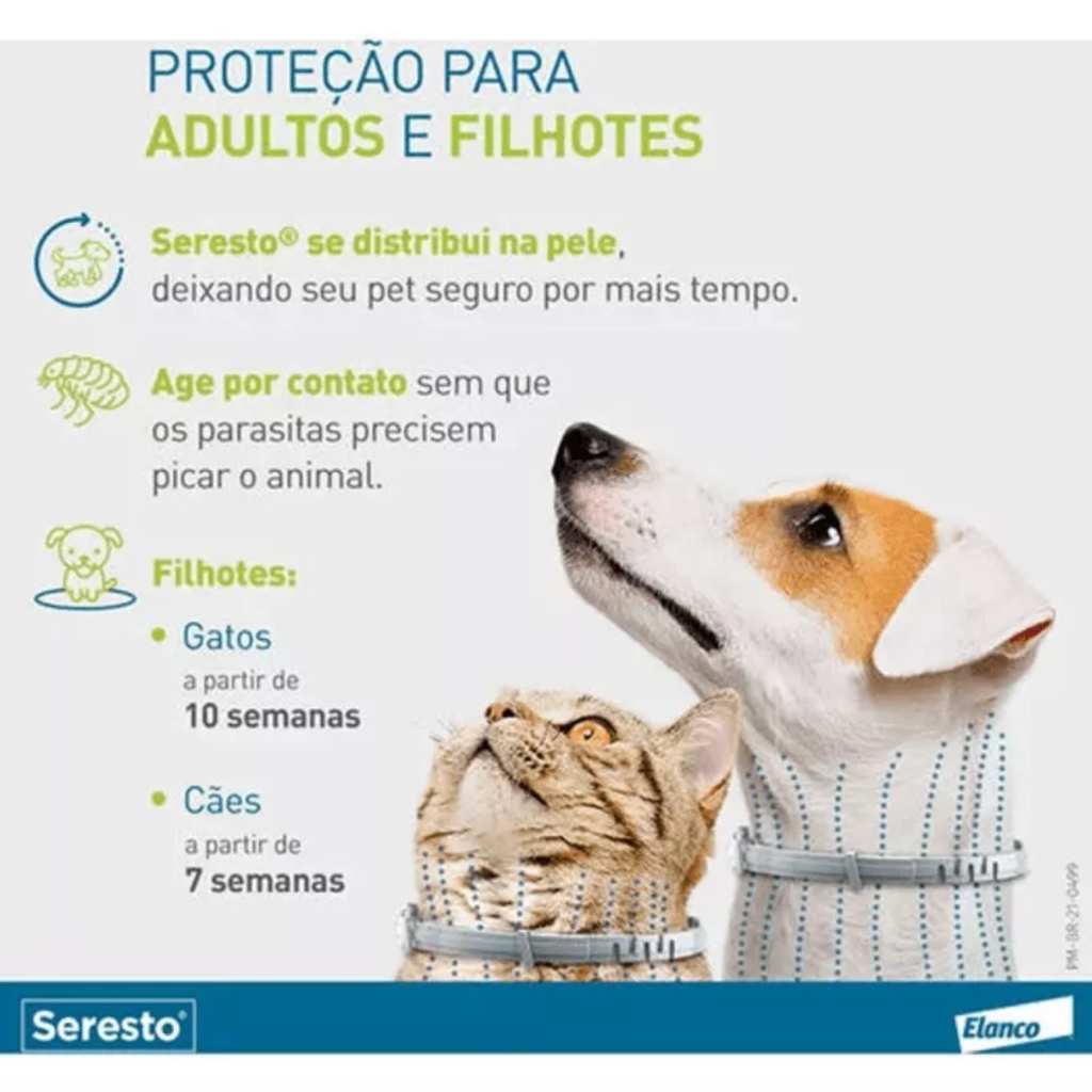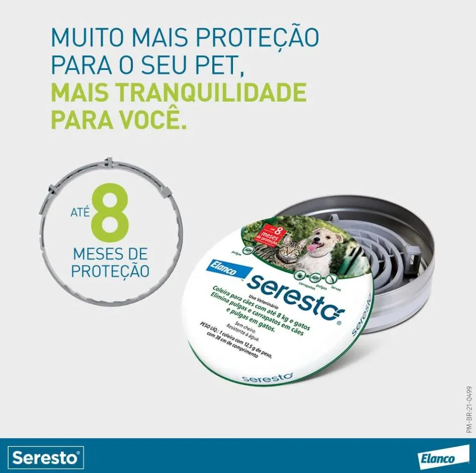 • Proteção prolongada: A Coleira Seresto oferece até 8 meses de proteção contra pulgas e carrapatos.