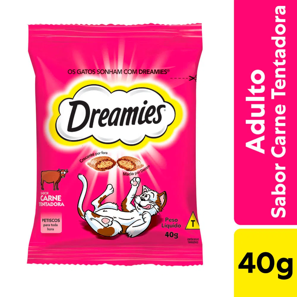 Petisco Dreamies Carne- 40gr São petiscos crocantes por fora e macios por dentro, para toda hora. Os novos petiscos Dreamies garantem diversão e mais momentos junto com seu gato. São deliciosos petiscos em três diferentes sabores: carne, frango e queijo.