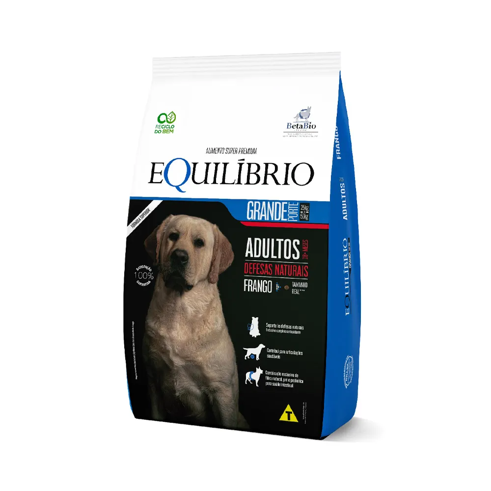 Ração Equilíbrio Cães Adultos de Raças Grandes 15kg é um alimento super premium completo para cães grandes – a partir dos 18 meses -e gigantes – a partir dos 24 meses. Sua fórmula tem sulfato de condroitina e glucosamina, que contribuem para manter as articulações saudáveis. Além disso, tem Hexametafosfato de Sódio, que auxilia no controle do tártaro, e Yucca schidigera, que reduz o odor das fezes.