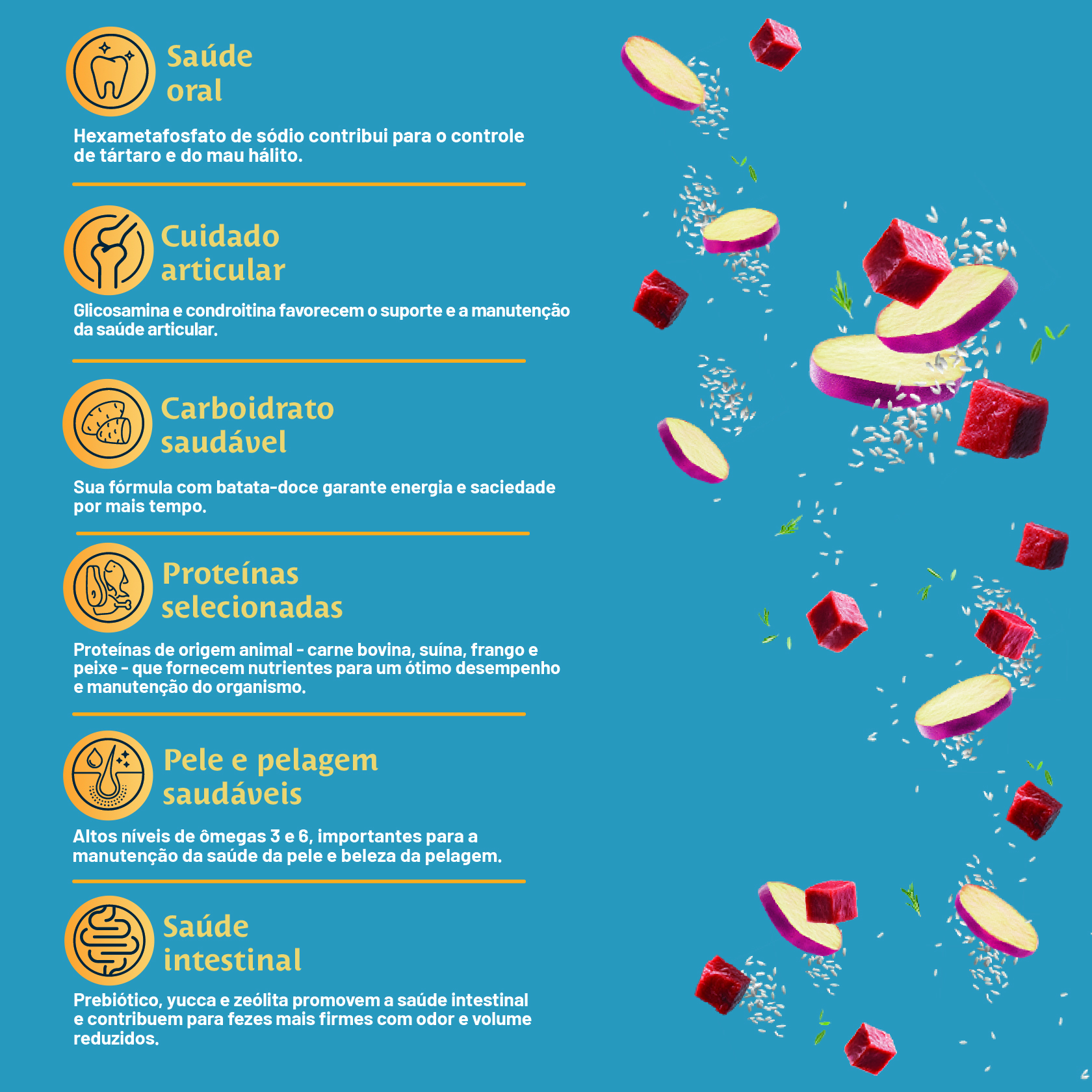 A ração é composta por uma seleção de ingredientes de alta qualidade, incluindo farinha de vísceras de frango, farinha de torresmo, farinha de peixes, milho moído, sorgo integral moído, e outros, que garantem uma alimentação balanceada para cães de raças pequenas.